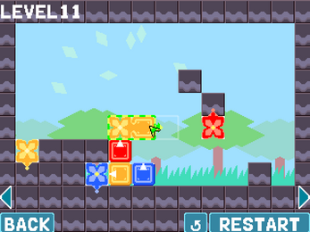 There are colorful square stones which you can move or swap horizontally by clicking them. If one of these stones touches a flower of the same color, a new flower blooms on the stone. The objective is to bloom flowers on all colored stones.